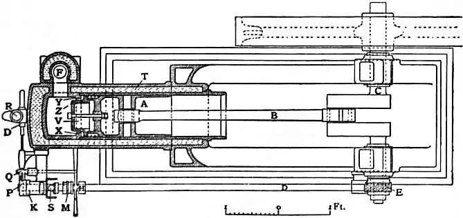 is compressed previous to explosion. Fig. 1 is a side elevation, fig. 2 is a sectional plan, and fig. 3 is an end elevation of an engine built about 1892 by Messrs Crossley of Manchester, who were the original makers of Otto engines in Great Britain. In external appearance it somewhat resembles a modern high-pressure steam engine, of which the working parts are exceedingly strong. In its motor and only cylinder, which is horizontal and open-ended, works a long trunk piston, the front end of which carries the crosshead pin. The crank shaft is heavy, and the fly-wheel large, considerable stored energy being required to carry the piston through the negative part of the cycle. The cylinder is considerably longer than the stroke, so that the piston when full in leaves a space into which it does not enter. This is the combustion space, in which the charge is first compressed and then burned. On the forward stroke, the piston A (fig. 2) takes into the cylinder a charge of mixed gas and air at atmospheric pressure, which is compressed by a backward stroke into the space Z at the end of the cylinder. The compressed charge is then ignited, and so the charge is exploded with the production of a high pressure. The piston now makes a forward stroke under the pressure of the explosion, and on its return, after the exhaust valve is opened, discharges the products of combustion. The engine is then ready to go through the same cycle of operations. It thus takes four strokes or two revolutions of the shaft to complete the Otto cycle, the cylinder being used alternately as a pump and a motor, and the engine, when working at full load, thus gives one impulse for every two revolutions. The valves, which are all of the conical-seated lift type, are four in number—charge inlet valve, gas inlet valve, igniting valve, and exhaust valve. The igniting valve is usually termed the timing valve, because it determines the time of the explosion. Since the valves have each to act once in every two revolutions, they cannot be operated by cams or eccentrics placed directly on the crank shaft. The valve shaft D is driven at half the rate of revolution of the crank shaft C by means of the skew or worm gear E, one wheel of which is mounted on the crank shaft and the other on the valve shaft. Ignition is accomplished by means of a metal tube heated to incandescence by a Bunsen burner. At the proper moment the ignition or timing valve is opened, and the mixed gas and air under pressure being admitted to the interior of the tube, the inflammable gases come into contact with the incandescent metal surface and ignite; the flame at once spreads back to the cylinder and fires its contents, thus producing the motive explosion.