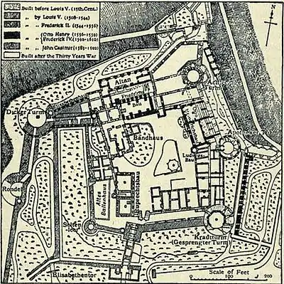 the east part of the town. It stands on the Jettenbühl, a spur of the Königsstuhl (1800 ft.), at a height of 330 ft. above the Neckar. Though now a ruin, yet its extent, its magnificence, its beautiful situation and its interesting history render it by far the most noteworthy, as it certainly is the grandest and largest, of the old castles of Germany. The building was begun early in the 13th century. The elector palatine and German king Rupert III. (d. 1410) greatly improved it, and built the wing, Ruprechtsbau or Rupert’s building, that bears his name. Succeeding electors further extended and embellished it (see Architecture, Plate VII., figs. 78-80); notably Otto Henry “the Magnanimous” (d. 1559), who built the beautiful early Renaissance wing known as the Otto-Heinrichsbau (1556–1559); Frederick IV., for whom the fine late Renaissance wing called the Friedrichsbau was built (1601–1607); and Frederick V., the unfortunate “winter king” of Bohemia, who on the west side added the Elisabethenbau or Englischebau (1618), named after his wife, the daughter of James I. of Great Britain and ancestress of the present English reigning family. In 1648, at the peace of Westphalia, Heidelberg was given back to Frederick V.’s son, Charles Louis, who restored the castle to its former splendour. In 1688, during Louis XIV.’s invasion of the Palatinate, the castle was taken, after a long siege, by the French, who blew part of it up when they found they could not hope to hold it (March 2, 1689). In 1693 it was again captured by them and still further wrecked. Finally, in 1764, it was struck by lightning and reduced to its present ruinous condition.