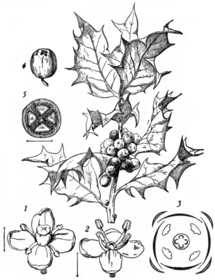 The wood of the holly is even-grained and hard, especially when from the heartwood of large trees, and almost as white as ivory, except near the centre of old trunks, where it is brownish. It is employed in inlaying and turning, and, since it stains well, in the place of ebony, as for teapot handles. For engraving it is inferior to box. When dry it weighs about 4712 ℔ per cub. ft. From the bark of the holly bird-lime is manufactured. From the leaves are obtainable a colouring matter named ilixanthin, ilicic acid, and a bitter principle, ilicin, which has been variously described by different analytical chemists. They are eaten by sheep and deer, and in parts of France serve as a winter fodder for cattle. The berries provoke in man violent vomiting and purging, but are eaten with immunity by thrushes and other birds. The larvae of the moths Sphinx ligustri and Phoxopteryx naevana have been met with on holly. The leaves are mined by the larva of a fly, Phytomyza ilicis, and both on them and the tops of the young twigs occurs the plant-louse Aphis ilicis (Kaltenbach, Pflanzenfeinde, 1874, p. 427). The custom of employing holly and other plants for decorative purposes at Christmas is one of considerable antiquity, and has been regarded as a survival of the usages of the Roman Saturnalia, or of an old Teutonic practice of hanging the interior of dwellings with evergreens as a refuge for sylvan spirits from the inclemency of winter. A Border proverb defines an habitual story-teller as one that “lees never but when the hollen is green.” Several popular superstitions exist with respect to holly. In the county of Rutland it is deemed unlucky to introduce it into a house before Christmas Eve. In some English rural districts the prickly and non-prickly kinds are distinguished as “he” and “she” holly; and in Derbyshire the tradition obtains that according as the holly brought at Christmas into a house is smooth or rough, the wife or the husband will be master. Holly that has adorned churches at that season is in Worcestershire and Herefordshire much esteemed and cherished, the possession of a small branch with berries being supposed to bring a lucky year; and Lonicerus mentions a notion in his time vulgarly prevalent in Germany that consecrated twigs of the plant hung over a door are a protection against thunder.