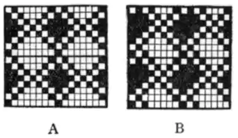 The figure shows two of the commonest designs which are used for these cloths, design A being what is often termed the “perfect honeycomb”; in the figure it will be seen that the highest number of successive white squares is seven, while the corresponding highest number of successive black squares is five. Two of each of these maximum floats form the top or highest edges of the cell, and the number of successive like squares decreases as the bottom of the cell is reached when the floats are one of black and one of white (see middle of design, &c.). The weave produces a reversible cloth, and it is extensively used for the embellishment of quilts and other fancy goods. It is also largely used in the manufacture of cotton and linen towels. B is, for certain purposes, a more suitable weave than A, but both are very largely used for the latter class of goods.