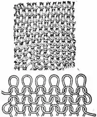 Warp Knitting in its simplest form consists of rows of loops, but the number of threads employed are equal to the number of loops in the width of the fabric. Thus it will be seen that the threads run lengthwise of the fabric (fig. 2). This principle gives greater scope for reproducing designs in openwork and colour than that of frame-work knitting. For this reason it is largely used in the shawl, glove and fancy hosiery industries.