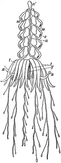 Chun (Hydrozoa [1]) maintains the older views of Leuckart and Claus, according to which the cormus is to be compared to a floating hydroid colony. It may be regarded as derived from floating polyps similar to Nemopsis or Pelagohydra, which by budding produce a colony of polyps and also form medusa-buds. The polyp-individuals form the nutritive siphosome or trophosome. The medusa-buds are either fertile or sterile. If fertile they become free medusae or sessile gonophores. If sterile they remain attached and locomotor in function, forming the nectosome, the pneumatophore and swimming-bells.