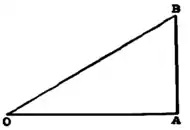 2. The guise in which variable quantities presented themselves to the mathematicians of the 17th century was that of the lengths of variable lines. This method of representing variable quantities dates from the 14th century, when it was employed by Nicole Oresme, who studied Geometrical representation of Variable Quantities. and afterwards taught at the Collège de Navarre in Paris from 1348 to 1361. He represented one of two variable quantities, e.g. the time that has elapsed since some epoch, by a length, called the “longitude,” measured along a particular line; and he represented the other of the two quantities, e.g. the temperature at the instant, by a length, called the “latitude,” measured at right angles to this line. He recognized that the variation of the temperature with the time was represented by the line, straight or curved, which joined the ends of all the lines of “latitude.” Oresme’s longitude and latitude were what we should now call the abscissa and ordinate. The same method was used later by many writers, among whom Johannes Kepler and Galileo Galilei may be mentioned. In Galileo’s investigation of the motion of falling bodies (1638) the abscissa OA represents the time during which a body has been falling, and the ordinate AB represents the velocity acquired during that time (see fig. 1). The velocity being proportional to the time, the “curve” obtained is a straight line OB, and Galileo showed that the distance through which the body has fallen is represented by the area of the triangle OAB.