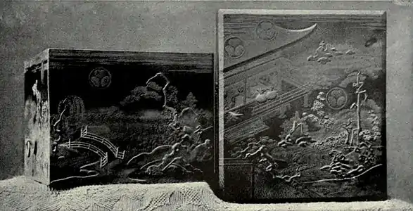 | Fig. 18.—LID OF BOX. By Korin. | Fig. 19.—CASE FOR HEAD OF A SKAKUJO. | Fig. 20.—OWL ON A BRANCH. By Ritsuo. | ||||||