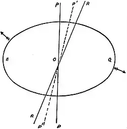 To show the cause of this motion, let BQ represent a section of an oblate spheroid through its shortest axis, PP. We may consider this spheroid to be that of the earth, the ellipticity being greatly exaggerated. If set in rotation around its axis of figure PP, it will continue to rotate around that axis for an indefinite time. But if, instead of rotating around PP, it rotates around some other axis, RR,