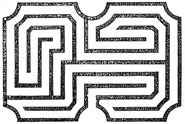 The heart wood of the laburnum is of a dark reddish-brown colour, hard and durable, and takes a good polish. Hence it is much prized by turners, and used with other coloured woods for inlaying purposes. The laburnum has been called false ebony from this character of its wood. LABYRINTH (Gr. λαβύρινθος, Lat. labyrinthus), the name given by the Greeks and Romans to buildings, entirely or partly subterranean, containing a number of chambers and intricate passages, which rendered egress puzzling and difficult. The word is considered by some to be of Egyptian origin, while others connect it with the Gr. λαῦρα, the passage of a mine. Another derivation suggested is from λάβρυς, a Lydian or Carian word meaning a “double-edged axe” (Journal of Hellenic Studies, xxi. 109, 268), according to which the Cretan labyrinth or palace of Minos was the house of the double axe, the symbol of Zeus.