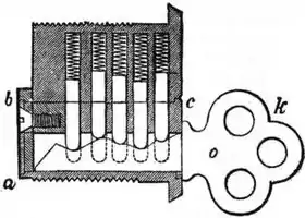 The first of these, invented by Robert Newell in 1841, was introduced into Great Britain from America by Hobbs in 1851. A simpler form, the construction of which is clearly shown by fig. 13, was brought out by Hobbs, Hart & Co. The bolt of this lock, instead of the ordinary main stump, carries a set of sliders, PPS, one corresponding to each lever and each carrying a projection S corresponding to a portion of the main stump. It will be seen that if any key having steps of certain lengths is inserted when the lock is unlocked and the bolt B thrown thereby, each slider will be raised to a height corresponding to that to which its lever is raised by the key, and the two fixed teeth CC will engage two of the teeth in the front of each slider, so that they will be held in place ready to enter the lever gatings when the same key is inserted.