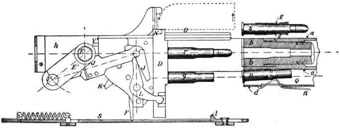 The Hotchkiss gun, figs. 14 to 16, which has been adopted by the French army and navy and elsewhere, depends for its action on the use of a small portion of the gases of the cartridge itself. The barrel A is firmly attached to the receiver or frame B, the latter Hotchkiss Gun. containing the breech and firing mechanism. Under the barrel A, and communicating with it by a port (c) near the muzzle is a cylinder or tube C. When the gun is fired, and the bullet has passed the port (c), a portion of the gases of explosion passes into the cylinder C and drives back the piston F contained in it, a lug on the under part of the piston compressing the spring M, the latter, when the trigger N is pulled, driving back the piston again. The reciprocating motion of the piston performs all the processes of loading and firing the gun, and the action is continuous as long as the trigger is kept pressed back.