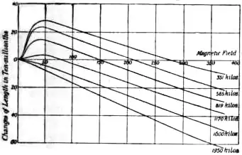 Most of the experiments described above have been repeated and the results confirmed by other workers, some of whom have added fresh observations. The complicated hysteresis effects which attend magnetic elongation and retraction have been studied by H. Nagaoka, who also, in conjunction with K. Honda, measured the changes of length of various metals shaped in the form of ovoids instead of cylindrical rods, and determined the magnetization curves for the same specimens; a higher degree of accuracy was thus attained, and satisfactory data were provided for testing theories. Among other things, it was found that the behaviour of cast cobalt was entirely changed by annealing; the sinuous curve shown in Fig. 24 was converted into an almost perfectly straight line passing through the origin, and lying below the horizontal axis; while the permeability of the metal was greatly diminished by the operation. They also tested several varieties of nickel-steel in the form of both ovoids and wires. With a sample containing 25% of nickel no appreciable change was detected; others containing larger percentages, and tested in fields up to 2000, all exhibited elongation, which tended to an asymptotic value as the field was increased. The influence of temperature varying between wide limits has formed the subject of a research by K. Honda and S. Shimizu. For soft iron, tungsten-steel and nickel little difference appeared to result from lowering the temperature down to −186° C. (the temperature of liquid air); at sufficiently high temperatures, 600° to 1000° or more, it was remarked that the changes of length in iron, steel and cobalt tended in every case to become proportional to the magnetic force, the curves being nearly straight lines entirely above the axis. The retraction of nickel was diminished by rising temperature, and at 400° had almost vanished. The influence of high temperature on cobalt was very remarkable, completely altering the character of the change of length: the curves for annealed cobalt show that at 450° this metal behaves just like iron at ordinary temperatures, lengthening in fields up to about 300 and contracting in stronger ones. The same physicists have made some additional experiments upon the effect of tension on magnetic change of length. Bidwell’s results for iron and nickel were confirmed, and it was further shown that the elongation of nickel-steel was very greatly diminished by tension; when[2]