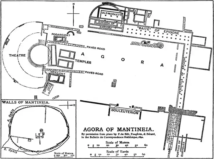 The site was excavated by M. Fougères, of the French School at Athens, in 1888. The plan of the agora and adjacent buildings has been recovered, and the walls have been completely investigated. The town was situated in an unusual position for a Greek city, on a flat marshy plain, and its walls form a regular ellipse about 212 m. in circumference. When the town was first formed in 470 B.C. by the “synoecism” of the neighbouring villages, the river Ophis flowed through the midst of it, and the Spartan king Agesipolis dammed it up below the town and so flooded out the Mantineians and sapped their walls, which were of unbaked brick. Accordingly, when the city was rebuilt in 370 B.C., the river Ophis was divided into