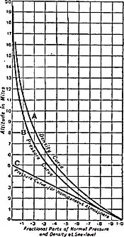 The vertical distribution of pressure as deduced from observation shows a rate of diminution with increasing altitude very closely but not entirely accordant with the laws of static equilibrium, as first elaborated by Laplace in his hypsometric formula. The departures from this law of static equilibrium are sufficient to show that, if our atmosphere is really in a state of equilibrium, it must be a matter of dynamics and not of statics. The general average relation of the density of the air to the altitude and tem erature, and the total pressure of the superincumbent atmospliere, are shown in the accompanying diagram (fig. 1), which is taken from a memoir on the e uations of motion by Joseph Cottier, published in the U.S. Monthly Weather Review for July 1897. The diminution of pressure with altitude, as shown in this diagram for average conditions, but not for the temporary conditions that continually occur, follows a logarithmic law, and can undoubtedly be extended upwards for the normal atmosphere only to a height of 20 or 30 m., owing to our uncertainty as to the actual conditions in the upper portions of the atmosphere. This diagram is based upon the assumption that the atmosphere is in a state of convective equilibrium such that the ascending and descending masses expand and cool as they ascend, or contract and warm up as the descend, nearly but not quite in accordance with the adiabatic law of the change of temperature in pure gases.