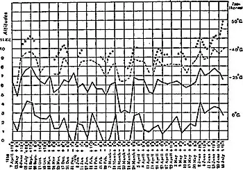 This diagram shows the height at which the isotherms of 0°, −25°, −40°, −50° C. were encountered on the respective dates. Below the ground-line are given both the dates and the temperatures of the air observed at the ground when the balloon started on each ascent. The isotherms of −40° and −50° are not given for certain ascents, because in these the balloon did not rise high, enough to encounter those temperatures.