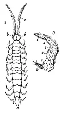 | Fig. 16.—1, Scutigerella sp? highly magnified (slightly modified from Packard); a, spinning sclerites; b, b, legs of first pair; c, antennae. 2, One of the functional legs further enlarged (from Wood Mason), showing the five joints and terminal pair of claws; b, parapod. |