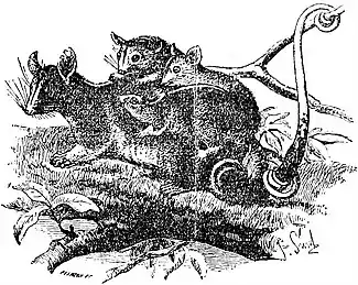 The fourth sub-genus (or genus) is Marmosa (Micourcus, or Grymacomys), differing from the two last by the smaller size of its members and by certain slight differences in the shape of their teeth. Its best-known species is the murine opossum (D. murina), no larger than a mouse, of a bright-red colour, found as far north as central Mexico, and extending thence to the south of Brazil. A second well-known species is D. cincrea, which ranges from Central America to western Brazil, Peru and Bolivia. Yet another group (Peramys) is represented by numerous shrew-like species, of very small size, with short, hairy and non-prehensile tails, not half the length of the trunk, and unridged skulls. The most striking member of the group is the Three-striped Opossum (D. americana) from Brazil, which is of a reddish grey colour, with three clearly-defined deep-black bands down its back, as in some of the striped mice of Africa. D. dimidiata, D. nudicaudata, D. domestica, D. unistriata and several other South American species belong to this group. Lastly we have the Chiloe Island opossum (D. gliroides), alone representing the sub-genus Dromiciops, which is most nearly allied to Marmosa, but differs from all other opossums by the short furry ears, thick hairy tail, doubly swollen auditory bulla, short canines and peculiarly formed and situated incisors.