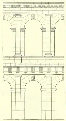 there were three storeys pierced with arcades, with the Corinthian order on the third storey, and a superstructure (added at a later date) without an arcade, and decorated with Corinthian pilasters only. Apparently this scheme of decoration was considered to be the best for the purpose, and with some slight changes was employed for all the amphitheatres throughout the Empire. The intercolumniation, on which the design is made, varies in the examples of later date. With an intercolumniation of 6 diameters, the arcades are wider and a lighter effect is obtained, and this is the proportion in the Colosseum.