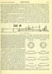 Rifling is the term given to the numerous shallow grooves cut spirally along the bore of a gun; the rib between two grooves is called the “land.” Rifling has been known for many years; it was supposed to increase the range, and no doubt did so, owing to the fact that the bullet havingRifling. to be forced into the gun during the loading operation became a mechanical fit and prevented to a great extent the loss of gas by windage which occurred with ordinary weapons. Kotter (1520) and Banner (1552), both of Nuremberg, are respectively credited as being the first to rifle gun barrels; and there is at the Rotunda, Woolwich, a muzzle-loading barrel dated 1547 rifled with six fine grooves. At this early period, rifling was applied only to small arms, usually for sporting purposes. The disadvantage of having, during loading, to force a soft lead (or lead-covered) ball down a bore of smaller diameter prevented its general employment for military use. In 1661 Prussia experimented with a gun rifled in thirteen shallow grooves, and in 1696 the elliptical bore—similar to the Lancaster—had been tried in Germany. In 1745 Robins was experimenting with rifled guns and elongated shot in England. During the Peninsular War about 1809, the only regiment (the “Rifle Brigade,” formerly called the 95th) equipped with rifled arms, found considerable difficulty in loading them with the old spherical lead bullet, from the muzzle. In 1856 Russia made a large number of experiments with a rifled gun invented by Montigny, a Belgian; this was not a success, but in England the guns invented by Major Cavalli, in 1845, and by Baron Wahrendorff in 1846, obtained some measure of favour. Both these guns were breech loaders. The Cavalli gun had a bore of 6.5 in. diameter; it was rifled in two grooves having a uniform twist of 1 in 25 calibres, and the elongated projectile had two ribs cast with it to fit the grooves, but no means were taken to prevent windage. The Wahrendorff gun had an enlarged chamber and the bore of 6.37 in. diameter was rifled in 2 grooves; the projectile had ribs similar to that for the CavaOi gun; but Wahrendorff had also tried lead-coated projectiles, the coating being attached by grooves undercut in the outside of the shell. In 1854 Lancaster submitted his plan of rifling; in this (fig. 22) the bore was made of an oval section which twisted round the axis of the gun from the breech to the muzzle; a projectile having an oval section was fired. Several old cast-iron guns bored on this system burst in the Crimean War from the projectile wedging in the gun. In 1855 Armstrong experimented with a breech-loading rifled gun, firing a lead-coated projectile. The rifling consisted of a large number of shallow grooves having a uniform twist of 1 in 38 calibres. When the gun was fired the lead-coated projectile, which was slightly larger in diameter than the bore of the gun, was forced into the rifling and so gave rotation to the elongated projectile.