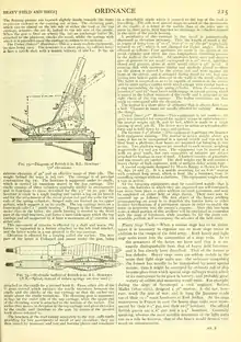attached to the cradle by a pivoted hook k. From either side of the U arms extend which embrace the cradle trunnions between the cradle and the cheeks of the top carriage so that the rocker can rotate about the cradle trunnions. The elevating gear is supported in lugs on the under side of the top carriage, while the upper end of the elevating screw is attached to the bottom of the rocker. The rocker thus moves in elevation in the top carriage and gives elevation to the cradle, and therefore to the gun, by means of the pivoted hook above referred to.