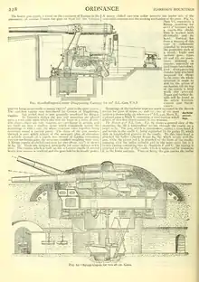 Plate VI., represents a Krupp mounting for an 1 1-2 howitzer, with a cupola-like shield. This is worked both electrically and by hand. Vertical fire from a weapon of this type is sufficiently powerful to penetrate the protective deck of a vessel. Light and medium guns, types (h) and (c), are sometimes mounted in cupolas, especially on land fronts (see below), and disappearing cupolas have also been proposed for them: in the latter the whole structure is made to sink by the action of mechanism till the top of the cupola is level with the ground. Types and further details will be found in the article Fortification AND Siege- craft. Mountings of the barbette type are much favoured in the British service for guns of types (a) and (b); one of the most modern is shown in fig. 21, where a 9-2" B.L. gun, Mark X.,