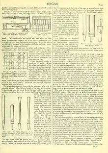 The conventional length of the C-pipe for stops having the normal pitch of the keys is 8 ft.; a pipe having twice this length sounds the octave below, a pipe having half that length the octave above, and soon. Thus stops which sound the octave below the normal pitch of the keys are spoken of as 16-foot stops. Even where the pipes are stopped so that the actual length is only 8 ft., they are spoken of as having " 16-ft.tone." Similarly 3 2-ft. stops sound two octaves below the normal pitch of the keys. But if these notes are produced by stopped pipes, whose actual length isonly i6ft., they arespokenof ashaving "32-ft. tone." Sixteenfoot and 32-ft. stops are specially characteristic of the pedal, where the names also signify the length of the open pipe which would sound the note actually produced by the lowest C. Of stops higher than the normal pitch of the keys, the octave is denoted by 4 ft. if made with open pipes, 4-ft. tone if stopped; the twelfth is commonly spoken of as 23, the fifteenth or double octave as 2 ft. Higher-sounding stops are occasionally used, but these generally form part of "mixtures, " and the foot lengths of the separate ranks are not usually given.