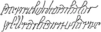 The characters are large, the line of writing being about three-fourths of an inch deep, and the heads and tails of the long letters are flourished; but the even slope of the strokes imparts to the writing a certain uniform and graceful appearance. As to the actual shape of the letters, as will be seen from the reduced facsimile here given, there may be recognized in many of them only a more current form of those which have been described above. The A and R may be distinguished by noticing the different angle at which the top strokes are applied; the B, to suit the requirements of the more current style, is no longer the closed d-shaped letter of the tablets, but is open at the bow and more nearly resembles a reversed b; the tall letters f, h, l, and long s have developed loops; O and v-shaped U are very small, and written high in the line. The letters which seem to differ essentially from those of the tablets are E, M, N. The first of these is probably explained correctly by Jaffé as a development of the earlier || quickly written and looped, and may be compared with the tick-shaped letter noticed above. The M and N have been compared with the minuscule forms of the Greek mu and nu, as though the latter had been adopted; but they may with better reason be explained as merely cursive forms of the Latin capitals M and N. That this hand should have retained so much of the older formation of the Roman cursive is no doubt to be attributed to the fact of its being an official style of writing which would conform to tradition.