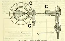 loads. The principal difference between this engine and the Hornsby engine already described lies in the use of the separate ignition tube H and in the water sprayer F, which acts as a sniffing valve, taking in a little air and water when the engine becomes hot. Messrs Crossley inform the writer that the consumption of either crude or refined oil is about -63 of a pint per horse-power on full load. They also give a test of a small engine developing 7 B.H.P., which consumed .601 pint per B.H.P. per hour of Rock Light refined lamp oil and only .603 pint per B.H.P. per hour of crude Borneo petroleum oil.