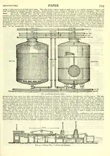 Two methods are in use, known respectively as the soda or alkaline process, and the sulphite or acid process, according as soda or sulphur (or rather sulphurous acid) forms the base of the reagent employed. Trees of medium age are usually selected, varying from seventy to eighty years’ growth and running from 8 to 12 in. in diameter. They are felled in winter and reach the mill in logs about 4 ft. long. After being freed from bark and the knots taken out by machinery, the logs are cut into small cubical chips about 5 to 34 in. in size by a revolving cutter. The chips are then bruised by being passed between two heavy iron rolls to allow the boiling solution thoroughly to penetrate them, and are conveyed to the boilers over a screen of coarse wire-cloth, which separates out the fine sawdust as well as any dirt or sand. In the soda process the wood is boiled in large revolving or upright stationary boilers for about seven or eight hours, in a similar manner to esparto and straw, though it requires much severer treatment. The steam pressure varies from 90 ℔ to as much as 150 ℔ per sq. in., and the amount of soda required is about 16% of Na2O, estimated on the barked and cleaned wood. The essential feature of the sulphite process is the employment of a solution of sulphurous acid combined with a certain amount of base, either magnesia or lime. As the acid reaction of the bisulphite solution would attack any exposed ironwork with which it comes in contact, the boilers in all cases should be lined with lead. The type of boiler employed varies according to the process adopted. The principal patents connected with the sulphite process are those of Tilghman, Ekman, Francke, Ritter-Kellner, Mitscherlich, and Partington. The subsequent operations, in both the acid and alkaline processes of washing, bleaching and straining the pulp, are all very similar to those described for esparto. Wood-pulp produced by the sulphite process differs in a marked degree from that made by the soda process; the fibre in the former case is harsher and stronger, and papers made from it are characterized by their hardness and transparency, whereas those made from soda pulp are softer and more mellow, corresponding in some way to the difference between linen and cotton fibres. Each class of pulp is largely used, both alone and mixed with other materials.