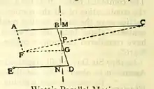 figure. MN is the path in which the piston-rod head, or cross head, as it is often called, is to be guided. ABC is the middle line of half the beam, C being the fixed centre about which the beam oscillates. A link BD connects a point in the beam with a radius link ED, which oscillates about a fixed centre at E. A point P in BD, taken so that BP: DP:: EN: CM, move in a path which coincides very closely with the straight line MPN. Any other point F in the line CP or CP produced is made to copy this motion by means of the links AF and FG, parallel to BD and AC. In the ordinary application of the parallel motion a point such as F is the point of attachment of the piston-rod, and P is used to drive a pump-rod. Other points in the line CP produced are occasionally made use of by adding other links parallel to AC and BD.