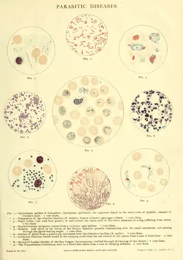 " 4 — Staphylococcus pyogenes aureus from a 1 2-hours' agar culture, x 1000 diam. " 5.— Malaria. Life cycle, in the blood, of the Tertian malarial parasite commencing with the small amoebulae and passing