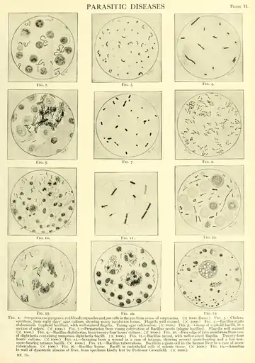Fig. 2.— -Streptococcus pyogenes, red blood corpuscles and pus cells in the pus from a case of empyaema. (X 1000 diams.) Fig. 3. — Cholera spirillum, from eight days' agar culture, showing many involution forms. Flagella well stained. (X 1000.) Fig. 4. — Bacillus tvphi abdominal is (typhoid bacillus), with well-stained flagella. Young agar cultivation. (X 1000.) Fig. 5. — Group of typhoid bacilli, in a section of spleen. (X 1000.) Fig. 7. — Preparation from young cultivation of Bacillus pestis (plague bacillus). Flagella well stained (X 1000.) Fig. 9. — Bacillus diphtheria, from twenty-four hours' culture. (X 1000.) Fig. 10. — Free edge of false membrane from case of diphtheria containing numerous diphtheria bacilli. (X looo.) Fig. ii. — Bacillus tetani, with well-stained flagella. Twenty-four hours' culture. (X 1000.) Fig. 12. — Scraping from a wound in a case of tetanus, showing several spore-bearing and a few nonspore-bearing tetanus bacilli. (X 1000.) Fig. 15. — Bacillus tuberculosis. Bacilli in a giant-cell in the human liver in a case of acute tuberculosis. (X 1000.) Fig. 16. — Bacillus leprae. Bacilli in endothelial cells of splenic tissue. (X 1000.) Fig. 19. — Amoebae in wall of dysenteric abscess of liver, from specimen kindly lent by Professor Greenfield. (X 1000.)