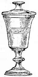 It is interesting to note the various changes of form through which the ecclesiastical chalice passed from early Christian times Chalices. till the 16th century. It was at first an ordinary secular cup with two handles, classical in form and of large capacity, because the laity as well as the clergy received the wine. The double handles were of practical use in passing the cup round like a modern “loving cup.” The first alteration was the omission of the handles, so that it took the form of a large hemispherical bowl, with a round foot and a knop for security in holding it. For some centuries it, appears to have been the custom for the priest to hold the chalice, while the communicant sucked the wine through a silver tube or “fistula.” Some of the most magnificent early examples of this form of chalice have the bowl mounted in bands, set with jewels, and enriched with minute filigree work—a design which appears to have been taken from those cups, such as the four magnificent examples in the treasury of St Mark's at Venice, which have their bowl cut out of crystal, onyx or some other precious stone.[1] The finest examples of this class are the Ardagh chalice, now in the Dublin Museum, and the chalice of St Remigius, in Reims cathedral; both are most magnificent specimens of the taste and skill of 10th to 11th century goldsmiths. In the 12th and 13th centuries the design becomes simpler; there is a distinct shaft, extending above and below the knop, and on the foot is marked a cross, not found in the earlier ones, to show which side the priest is to hold towards himself at celebration. The next alteration in the form of chalice, which occurred in the 14th century, was to make the foot not circular in plan but polygonal or lobed, so that the cup might not roll when laid on its side to drain, after it had been rinsed out. This form lasted in most countries till about 1500, and in England till the Reformation. Then the bowl, which in the previous two or three centuries had been slowly reduced in size, owing to the gradually introduced practice of refusing the wine to the laity, was suddenly made more capacious, and the form was altered to the shape shown in fig. 18, in order that the Protestant “communion cup” might bear no resemblance to the old Catholic “massing chalice.” This was ordered to be done in 1562 (see Arch. Journ. xxv. 44-53). The best account of the evolution in the form of English medieval chalices and patens is by W. H. St John Hope and T. M. Fallow, in Archaeologia, vol. xliii.
