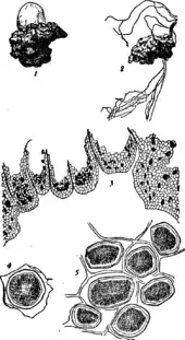 The tubers frequently show scurfy or scab-like spots upon their surface, thus greatly depreciating their value for market purposes. The fungus, Sorosporium scabies, which is the cause of the scab, does not penetrate into the flesh of the tuber, nor detract from its edible properties. Excess of lime in the soil is said to favour the development of the fungus. Similar spots are produced on potatoes in America by the fungus Oospora scabies, and in both cases, if affected “seed” potatoes are steeped in a solution of ½ pint formalin in 15 gallons of water for two hours before planting, the attack on the resulting crop is materially lessened. The fungus, Oedomyces leproides, produces large, blackish, irregular warts which sometimes involve the whole surface of the tuber. This disease is of recent introduction into Great Britain, but bids fair to become very troublesome. The spores of the fungus pass the winter in the soil and the delicate mycelium attacks the young shoots in the summer. These become brown, finally blackish and greatly contorted until a large scab is formed on the developing tuber, whence the name by which the disease is known—“black scab.” Diseased potatoes left in the soil and even slightly diseased “sets” are a source of infection of succeeding crops. Rotation must be observed and no diseased sets planted.