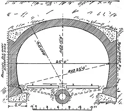 The Metropolitan and Metropolitan District railways followed the art of railway building as it existed at the time they were laid out. Wherever possible the lines were constructed in open cutting, to ensure adequate ventilation; and where this was not possible they were built by a method suggestively named “cut and cover.” A trench was first excavated to the proper depth, then the side walls and arched roof of brick were put in place, earth was filled in behind and over the arch, and the surface of the ground restored, either by paving where streets were followed, or by actually being built over with houses where the lines passed under private property. Where the depth to rail-level was too great for cut-and-cover methods, ordinary tunnelling processes were used; and where the trench was too shallow for the arched roof, heavy girders, sometimes of cast iron, bridged it between the side walls, longitudinal arches being turned between them (fig. 30).