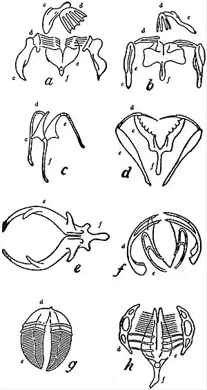 Fig. 4.—Types of Trophi. a, malleate, with enlarged view of malleus above—the Y-shaped incus consists of a short median fulcrum bearing two large rami, each of which is in contact with a stout malleus consisting of a toothed uncus carried on a long manubrium; b, sub-malleate, with enlarged view of malleus—the manubria are twice as long as the 3- to 5-toothed unci; c, virgate—mallei rod-like, manubria and fulcrum very long, unci 1-or 2-toothed; d, forcipate—rami large and used as a forceps, mallei rod-like, unci pointed or evanescent; e, incudate—stout fulcrum, rami forming a forceps, mallei evanescent; f, uncinate—unci large, 2-toothed, manubria evanescent, incus slender; g, ramate—rami subquadrantic, fulcrum rudimentary, manubria evanescent; h, malleo-ramate—mallei fastened by their unci to the rami, manubria looped, rami large and fulcrum slender. |