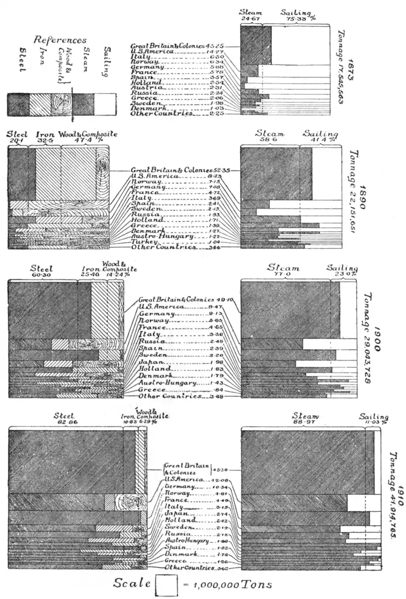 Table II. for 1910. The tonnages for 1900 and 1890 are prepared on the same basis, while those for 1873 are gross steam and gross sailing. |