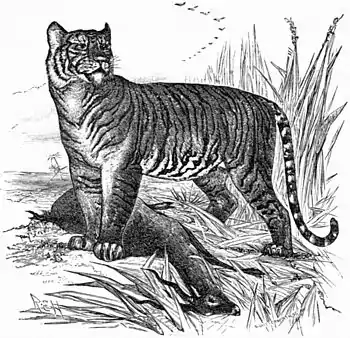 TIGER (Felis tigris), an animal only rivalled by the lion in size, strength and ferocity among the cat-like beasts of prey (see Carnivora). Almost everything that is stated in the article Lion concerning the structure of the skeleton, teeth and claws of that animal will apply equally well to the tiger, the difference between the two lying mainly in the skin and its coverings. A tiger's skull may, however, always be distinguished from that