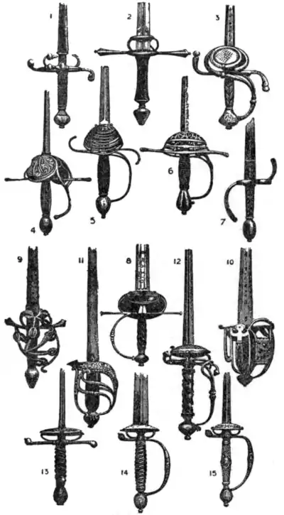 | 7, English musketeer’s sword early 17th century. | 14, 15, Small-swords, 1700–1750. |