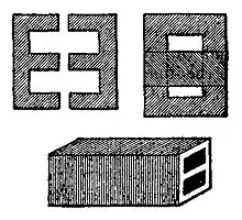 Alternating Current Transformer.—The typical alternating current transformer consists essentially of two insulated electric circuits wound on an iron core constituting the magnetic circuit. They may be divided into (1) open magnetic circuit static transformers, and (2) closed magnetic circuit static transformers, according as the iron core takes the form of a terminated bar or a closed ring. A closed circuit alternating” current transformer consists of an iron core built up of thin sheets of iron or steel, insulated from one another, and wound over with two insulated conducting circuits, called the primary and secondary circuits. The core must be laminated or built up of thin sheets of iron to prevent local electric currents, called eddy currents, from being established in it, which would waste energy. In practical construction, the core is either a simple ring, round or rectangular, or a double rectangular ring, that is, a core whose section is like the figure 8. To prepare the core, thin sheets of iron or very mild steel, not thicker than .014 of an inch, are stamped out of special iron (see Electromagnetism) and carefully annealed.