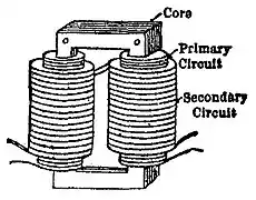 TRANSFORMERS. An electrical transformer is the name given to any device for producing by means of one electric current another of a different character. The working of such an appliance is, of course, subject to the law of conservation of energy. The resulting current represents less power than the applied current, the difference being represented by the power dissipated in the translating process. Hence an electrical transformer corresponds to a simple machine in mechanics, both transforming power from one form into another with a certain energy-dissipation depending upon frictional losses, or something equivalent to them. Electrical transformers may be divided into several classes, according to the nature of the transformation effected. The first division comprises those which change the form of the power, but keep the type of the current the same; the second those that change the type of the current as well as the form of power. The power given up electrically to any circuit is measured by the product of the effective value of the current, the effective value of the difference of potential between the ends of the circuit and a factor called the power factor. In dealing with periodic currents, the effective value is that called the root-mean-square value (R.M.S.), that is to say, the square root of the mean of the squares of the time equidistant instantaneous values during one complete period (see Electrokinetics). In the case of continuous current, the power factor is unity, and the effective value of the current or voltage is the true mean value. As the electrical measure of a power is always a product involving current and voltage, we may transform the character of the power by increasing or diminishing the current with a corresponding decrease or increase of the voltage. A transformer which raises voltage is generally called a step-up transformer, and one which lowers voltage a step-down transformer.