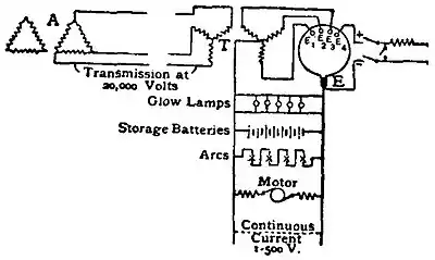 Fig. 15. motor enters the continuous current armature and creates around it a rotary field. The connexions are such that the rotating field turns in a direction opposite to that in which the armature is turning, so that the field is stationary in space. From the continuous current armature can therefore be drawn off a continuous current and the device acts as a transformer of three-phase alternating current to a continuous current.