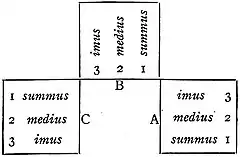 TRICHINOSIS, or Trichiniasis, a disease, in man and other animals, caused by infection by the parasite trichina or trichinella spiralis. The presence of encysted trichinae in the muscles was discovered by Sir James Paget (q.v.) in 1835, and they were named by Sir R. Owen; but it was not until some years after that the clinical characters of the acute disease caused by the invasion of the parasite were discovered. This discovery was made in 1860 by Friedrich von Zenker (1825-1898) on examining the abdominal muscles of a patient who died at Dresden with symptoms taken to be those of typhoid fever, the cases being afterwards accounted one of trichinosis on the post mortem evidence. Epidemics of this disease occur from time to time, especially in north Germany, from the eating of uncooked swine's flesh, in which trichinae are not uncommon. Out of 6329 cases in Germany during the years 1891 to 1898, 5456 occurred in states where raw pork is a common article of food. And, from the point of view of public health, the hog is the animal which is the main source of infection, others—except rats—being only rarely infested with the parasite. The greatest care is now taken to examine the carcases of swine for trichinae, a piece of the diaphragm of every animal being searched with the microscope by an inspector specially appointed, and the trichinous hogs being condemned. But it has not been found that this microscopic examination serves as an effective check; indeed it is apt to create a false feeling of security. Over 32% of the German cases of trichinosis between 1881 and 1898 were traced to meat so inspected and passed as free from trichinae. In America accordingly microscopic examination is not considered to give any guarantee of soundness from trichinae, in spite of a government mark “inspected and passed” (see B. H. Ransom, Circular 108 of U.S. Dep. of Agriculture, 1907). The symptoms in man are occasioned by the presence of the free parasites in the intestine, by the development of young trichinae from the eggs, and most of all by the migration of the parasites from the intestinal canal to the muscles, where they become quiescent. This cycle occupies from four to six weeks. Lime-salts become deposited in the capsule, the calcification rendering the cyst visible, and this change usually takes five or six months. When consumed in small quantity, the parasites may give rise to no marked symptoms, and they are sometimes found accidentally in muscular fibre in the bodies of those who had probably experienced no definite symptoms from their invasion. In the more acute and serious cases, sometimes ending fatally, the early symptoms are nausea, failure of appetite, diarrhoea and fever; later, when the migration to the muscles begins, there is more fever, stiffness, pain and swelling in the limbs, swelling of the eyelids, continued exhausting diarrhoea, perspirations and sometimes delirium. During convalescence there is desquamation of the cuticle. The discovery by T. R. Brown of a marked leucocytosis with an extraordinary increase of eosinophiles now enables a diagnosis to be made in cases where the symptoms are obscure. If the diagnosis be made early in the case, brisk purgatives, particularly calomel, are the best treatment; if the parasites are already on their way to the muscles, the only thing left to do is to support the patient's strength. There need, however, be no fear of infection at all if the meat be thoroughly cooked and cured before eaten. This is the only effective precaution. TRICK, a crafty or fraudulent device, deceitful artifice or stratagem, hence an exhibition of skill, especially in sleight of hand or jugglery, the term being also used of a peculiar trait or manner of speech, character or physical habit. A specific use is that for the cards played at a single round, which are taken up and count towards the winning of the game. The origin of the word is ultimately to be found in Lat. tricae, trifles, hindrances, wiles, whence tricari, to delay, shuffle, play tricks, which has also given “intricate,” “extricate,” “intrigue.” The M. Eng. trichen, to cheat or trick, was adapted from the O. Fr. trichier, trechier, whence came trecherie, Eng. “treachery,” a betrayal of faith, perfidy or trickery of the grossest kind. There has been also a confusion, which has influenced the meaning and form of “trick,” with the Dutch trekken, to pull, draw, cf. the South African Dutch trek, a journey, migration, properly the action of drawing a vehicle or travelling by ox-wagon. “Trick” or “tricking” is thus used, in heraldry, as the technical term for the drawing of a coat of arms in monochrome, giving the tinctures by the conventions of vertical, horizontal or diagonal lines, &c. TRICLINIUM, in Roman antiquities, a set of three couches (lecti) arranged round a four-sided dining table, one side of which was left open to provide free access for the attendant slaves. These couches were distinguished as the highest (A, lectus summus), the middle (B, lectus medius) and the lowest (C, lectus imus); the guests who reclined on B had A on their left and C on their right. Each couch was usually occupied by three persons, whose left arm rested on a cushion, the right hand being thus disengaged for purposes of eating. The nine places were allotted in accordance with strict etiquette. A and B were reserved for the guests (B for the most distinguished), C for the host and his family. In A and C the chief place was 1; in B it was 3, which was consequently the place of honour at the banquet. It was called locus consularis (ὑπατικός), probably as being next to the host. Another explanation is that, since it was on the open and unsupported side of the couch, it was chosen in order that, if a consul happened to be present among the guests, he might be able to receive communications, sign documents or transact business with the least inconvenience. It the locus classicus in H