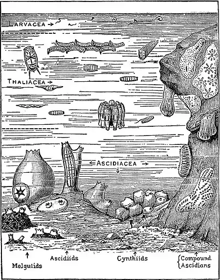 | Fig. 16.—Sketch of the chief kinds of Tunicata found in the sea. |