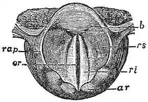 Fig. 7.—Arrangement of Glottis previous to Emission of a Sound. b, epiglottis; rs, false cord; ri, true vocal cord; ar, arytenoid cartilages. (From Mandl.) | ||