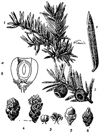 YEW (Taxus baccata), a tree which belongs to a genus of Coniferae (see Gymnosperms), in which the ordinarily woody cone is represented by a single seed surrounded by a fleshy cup.