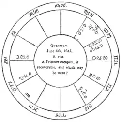 Astrological calculations are made by means of the sun, moon, and planets, the signs of the Zodiac, and the various aspects and relations of the planets. To work the problems, a "figure of the heavens" is drawn. This is merely a map to represent the heavens at any particular moment, such as when a child is born, a question asked, etc. It is made by drawing three circles and then drawing lines to represent the horizon, and others at right angles with them to represent the meridian. Thus will be shown the