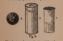 Wet the top of a new shaving stick and press the confetti-covered disk on it with the con- fetti side up, as in C, till the wet soap sets, when it will hold almost as firmly as if glued. Conceal this in the box of mixed confetti and you are ready for the performance. Fill the box once or twice, letting the con-