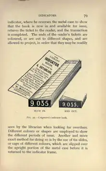 indicator, where he reverses the metal case to show that the book is now in and available for issue, returns the ticket to the reader, and the transaction is completed. The ends of the reader's tickets are coloured, or are cut to different shapes, and are allowed to project, in order that they maybe readily