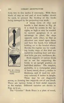 A cheap form of step and handle is that shown in Fig. 38. It is fixed by screws to the uprights, as high as may be needed. In narrow gangways it is an advantage to place the steps opposite each other, so that an attendant can stand upon them, and have his hands free without holding on to the bracket above. Besides the regular use for reaching books, steps of this kind are useful for reaching door and window bolts, gas jets, ventilators, &c. Book supports of various kinds are in use for supporting the books in an upright position on half-filled shelves. The simplest, probably, is a rectangular piece of heavy wood, about 3 inches in thickness, and (if used for ordinary octavos) 8 inches in height. These may be cut diagonally across, so forming two supports out of one block. There are various forms of bent metal supports in the market. Different varieties are shown in Figs. 39 to 41.
