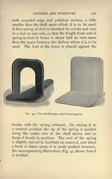 books, with the spring outward. On raising it to a vertical position the tip of the spring is pushed along the under side of the shelf above, and so keeps it firmly in position. The end of the spring is slightly curved to facilitate its removal, and when a book is taken away, it is easily pushed forward; the accompanying illustration, Fig. 42, shows how it is worked.