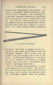 printed matter being hidden by the fastening. For ordinary newspapers without illustrations there are many forms of fasteners. The "Cummings" is a somewhat expensive contrivance of gun-metal, which is fastened by a key or a revolving eccentric nut. The "Chivers," shown in Fig. 63, is a steel rod, hinged at one end, and fastened with a lock at the other, which drops into a groove in a strip of wood. It is readily movable without disfiguring