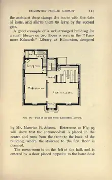 A good example of a well-arranged building for a small library on two floors is seen in the "Passmore Edwards" Library at Edmonton, designed